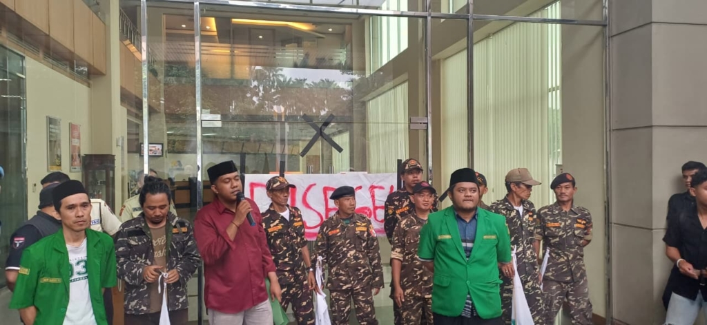 Aksi unjuk rasa dari GP Ansor Kota Bogor menyegel kantor Bank Mega di Jalan Juanda Kota Bogor pada Senin, 20 Oktober 2025. (Dok : Dadan).